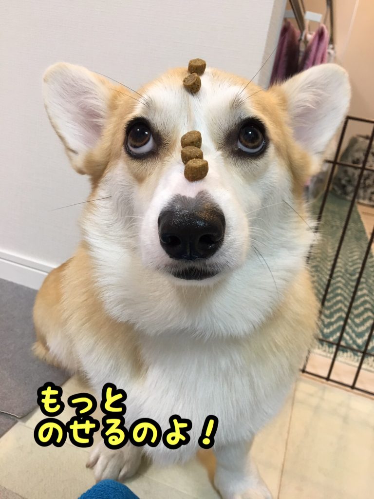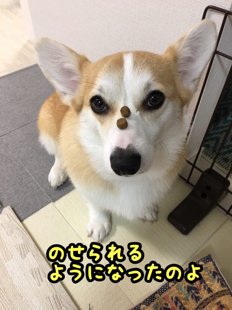 さて、ツイッターやフェイスブックでマズルの上におやつを置いている写真がよくあったのでむぎちゃんでもチャレンジしていました(´ω`*)