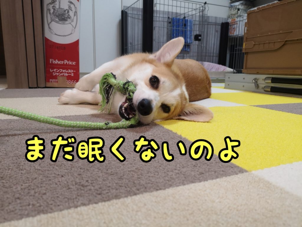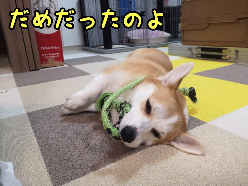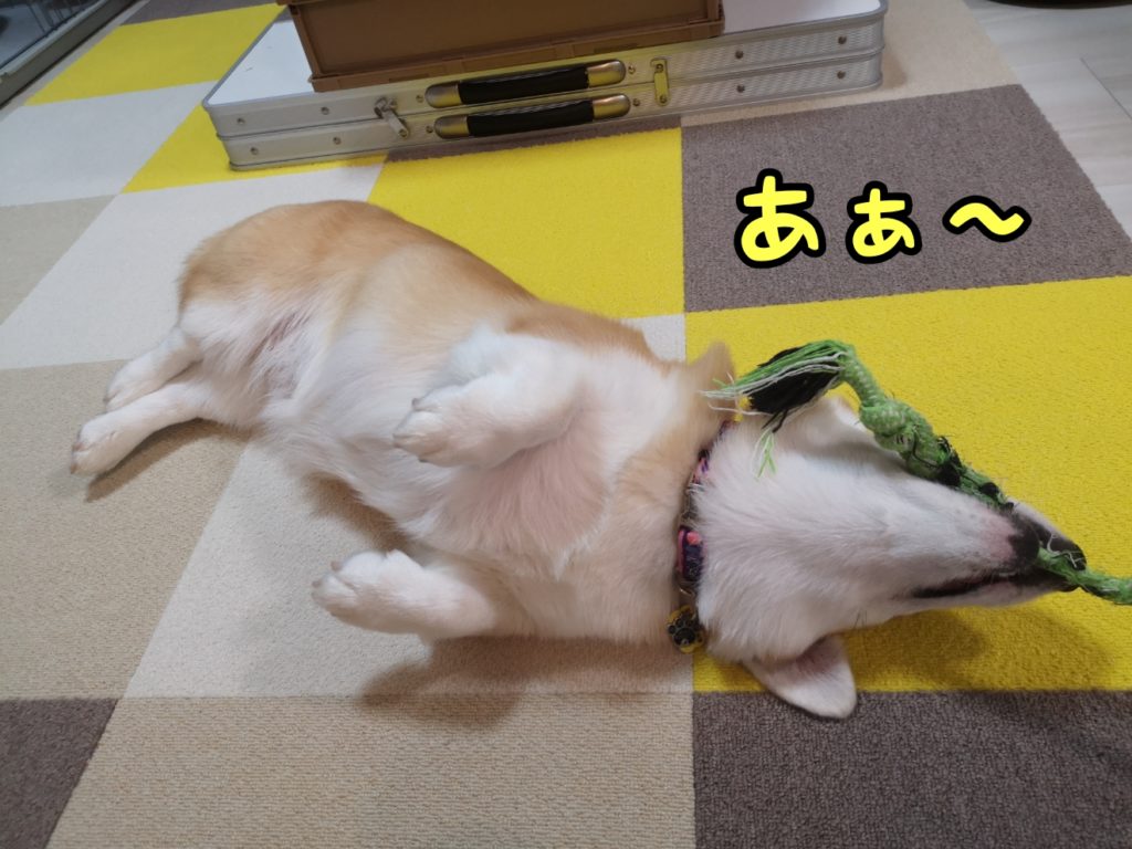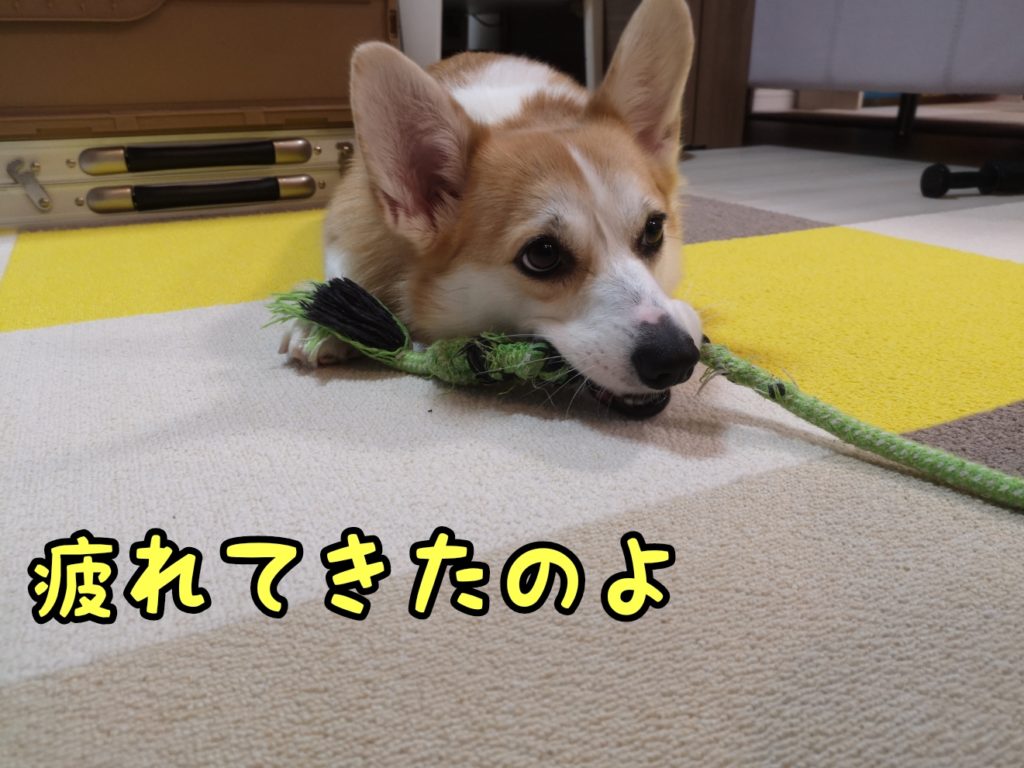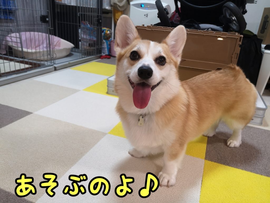 さて、コーギーむぎちゃんは天気が悪いので家の中で遊んでいるようです(/・ω・)/