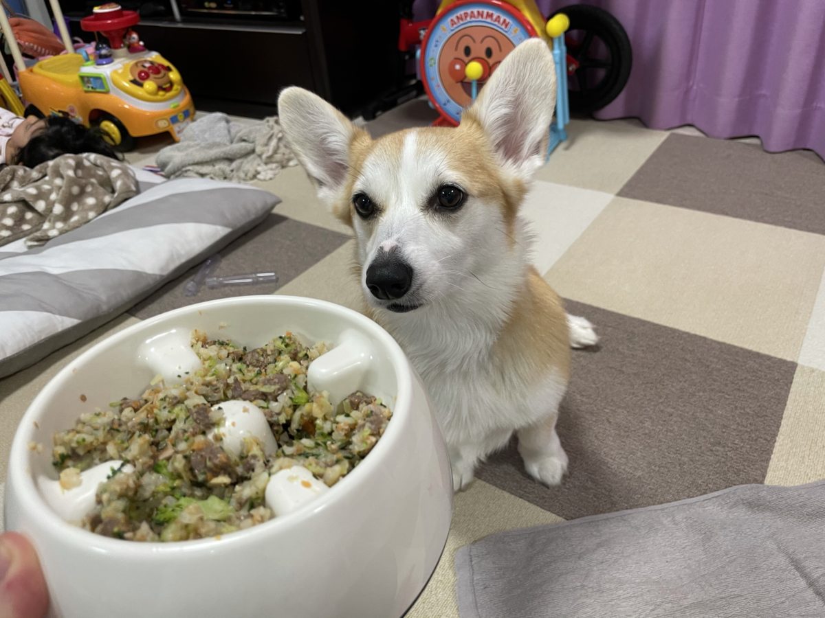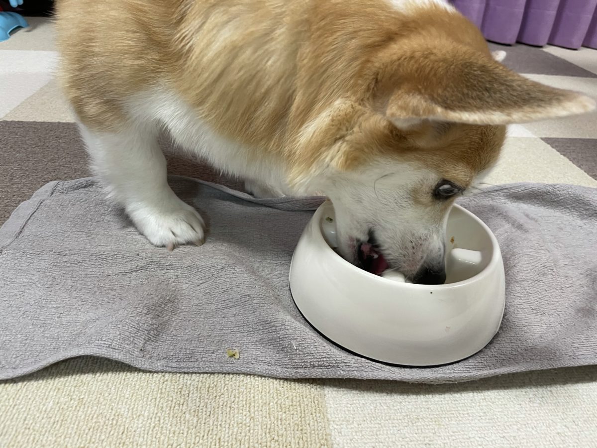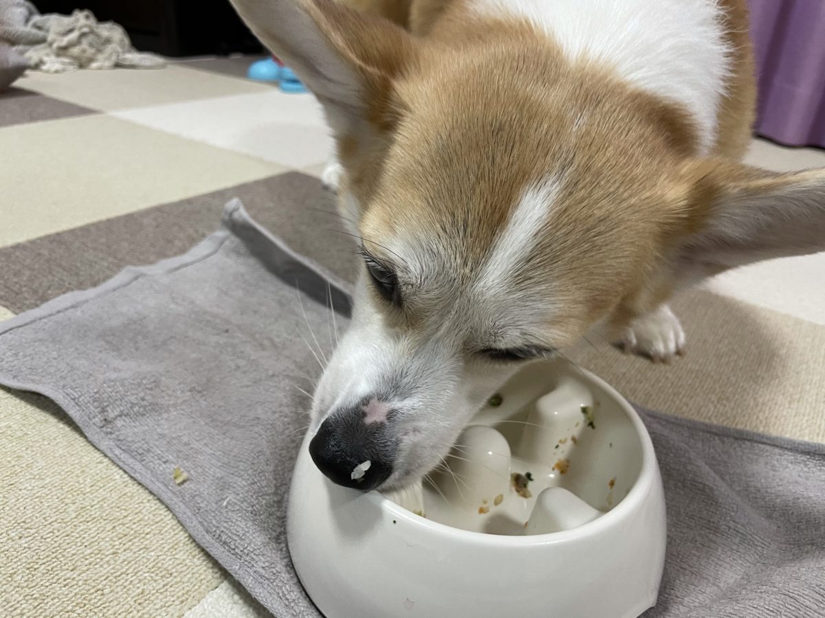 小さいワンコだと、これ1つで1食でいいのかもしれませんが、むぎちゃんは中型犬なので、日々のドライフードの量を調節しながら食べていただきました。