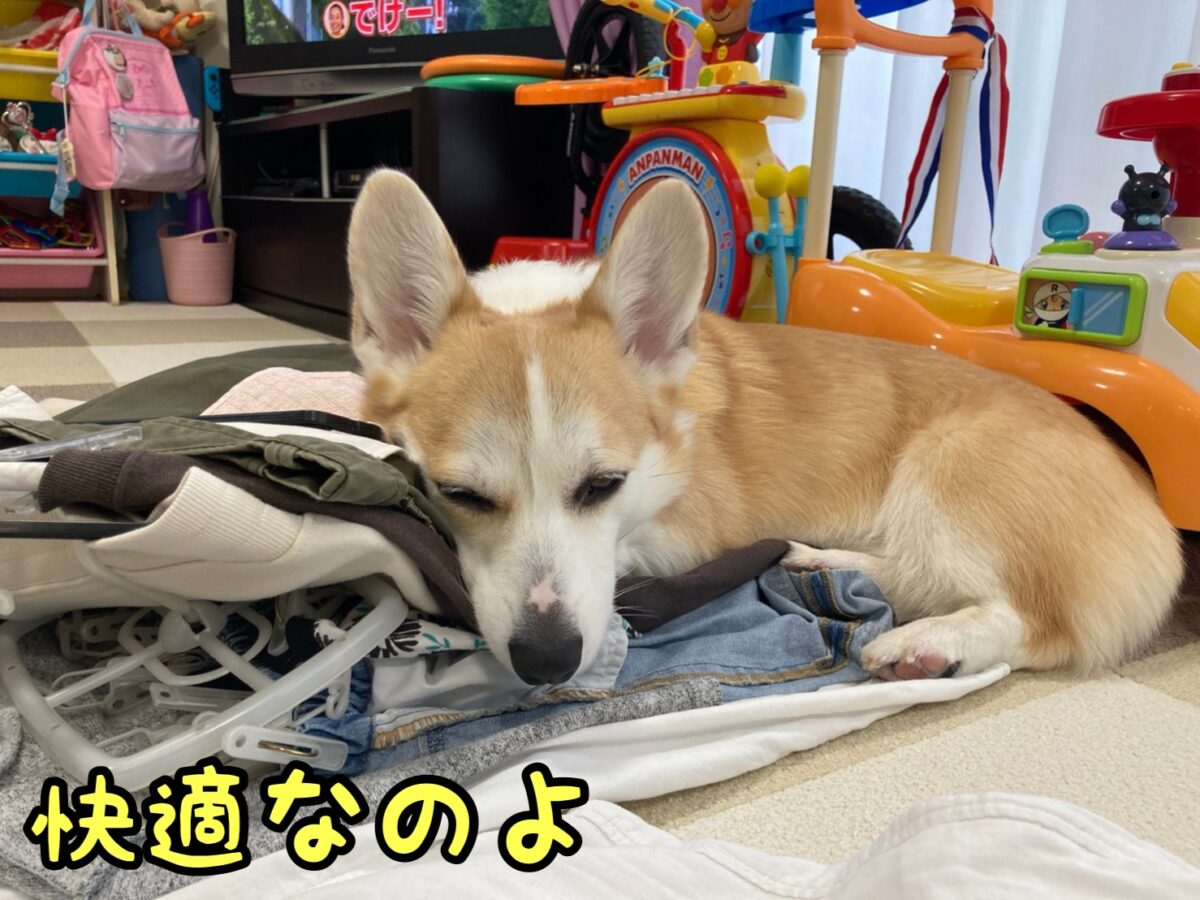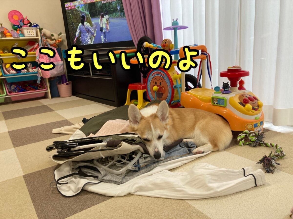 さて、コーギーむぎちゃんはなんか洗濯物が好きなようです(・Д・`)