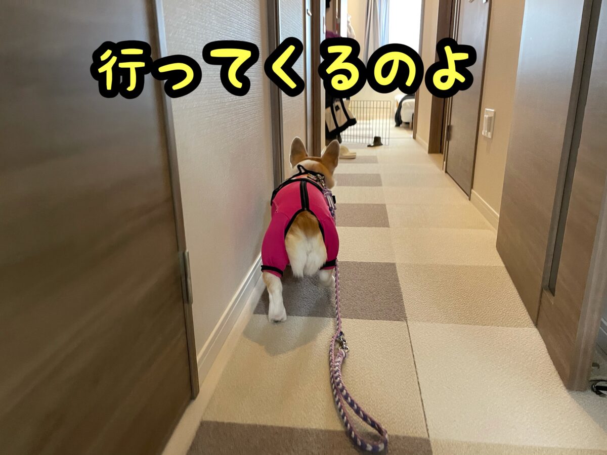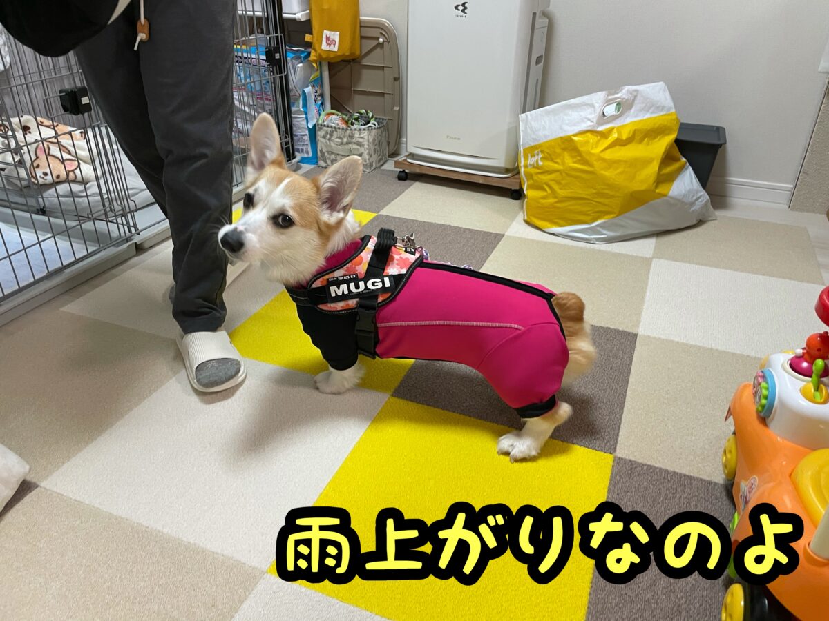 さて、コーギーむぎちゃんは雨スタイルになるようです(/・ω・)/