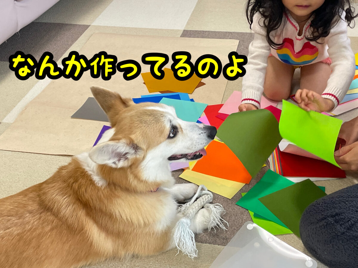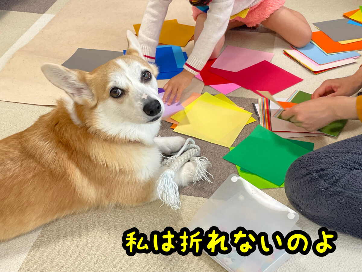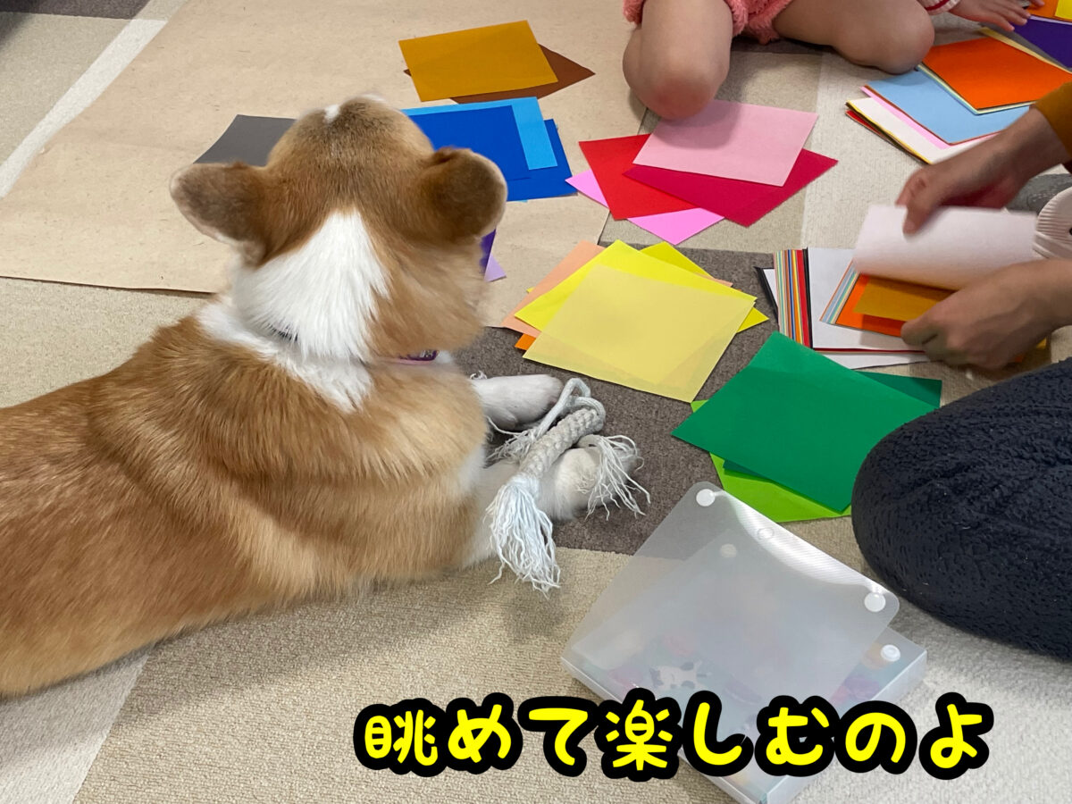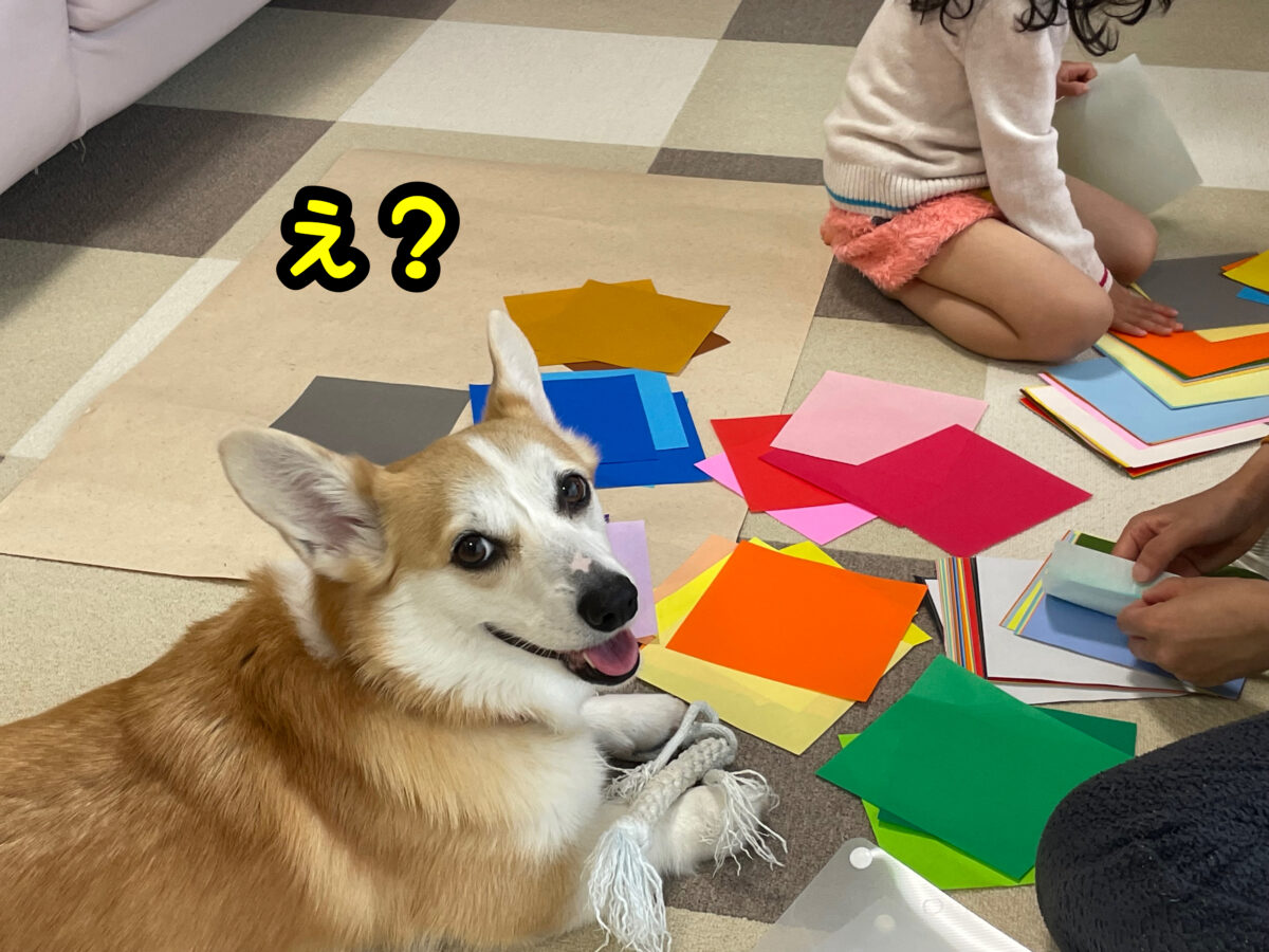 さて、コーギーむぎちゃんは折り紙を見ているようです(/・ω・)/