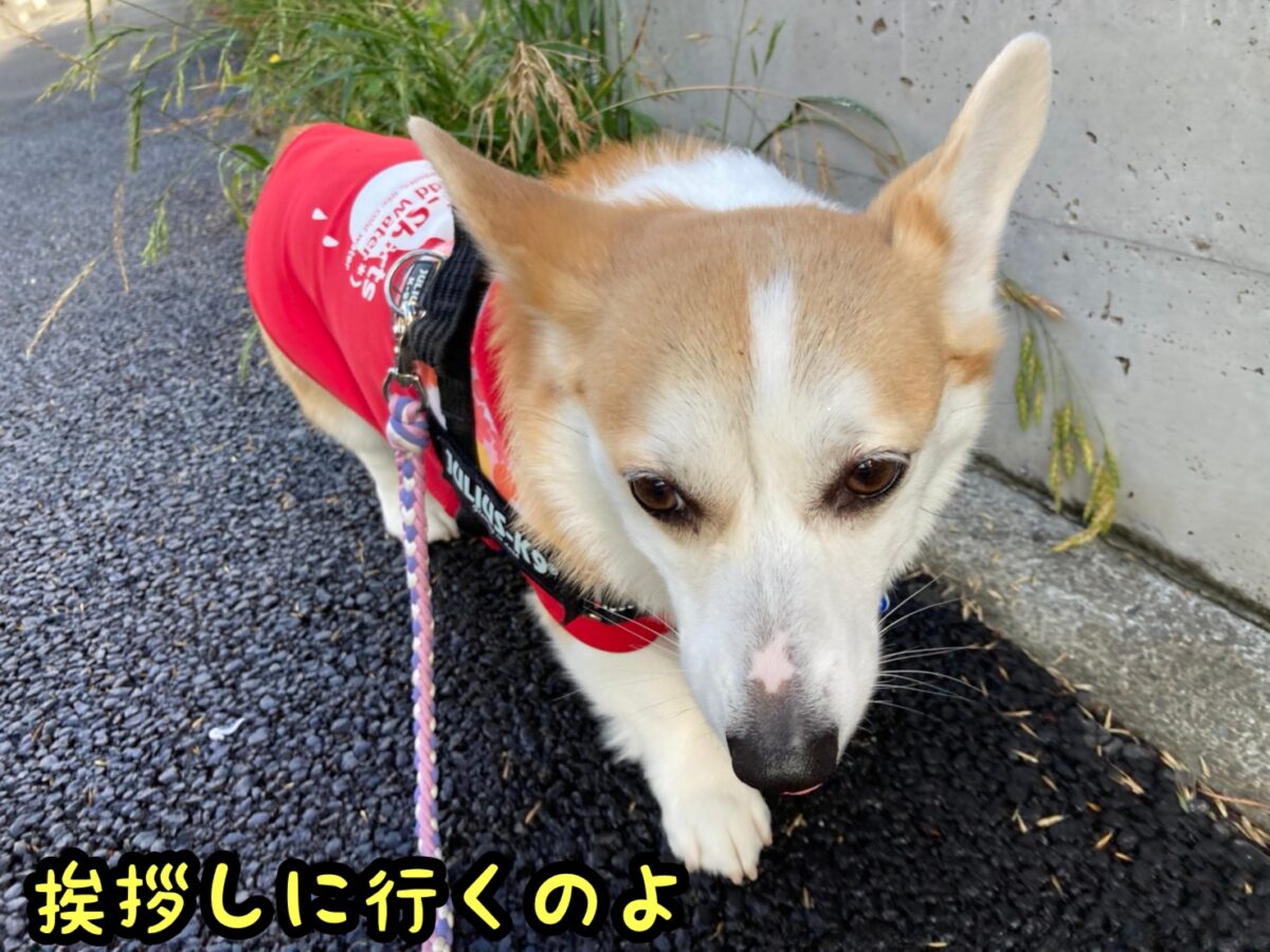 さて、コーギーむぎちゃんは挨拶をしに行くようです(/・ω・)/