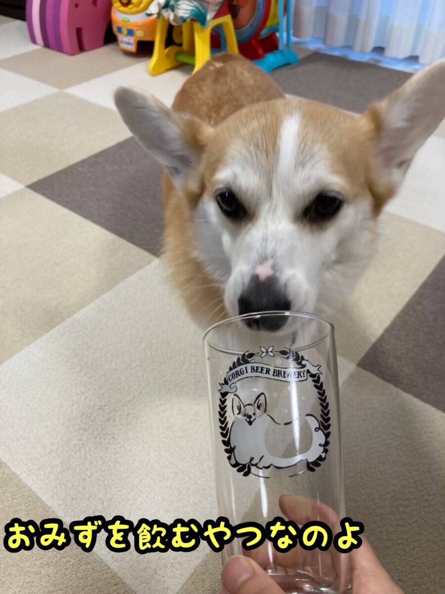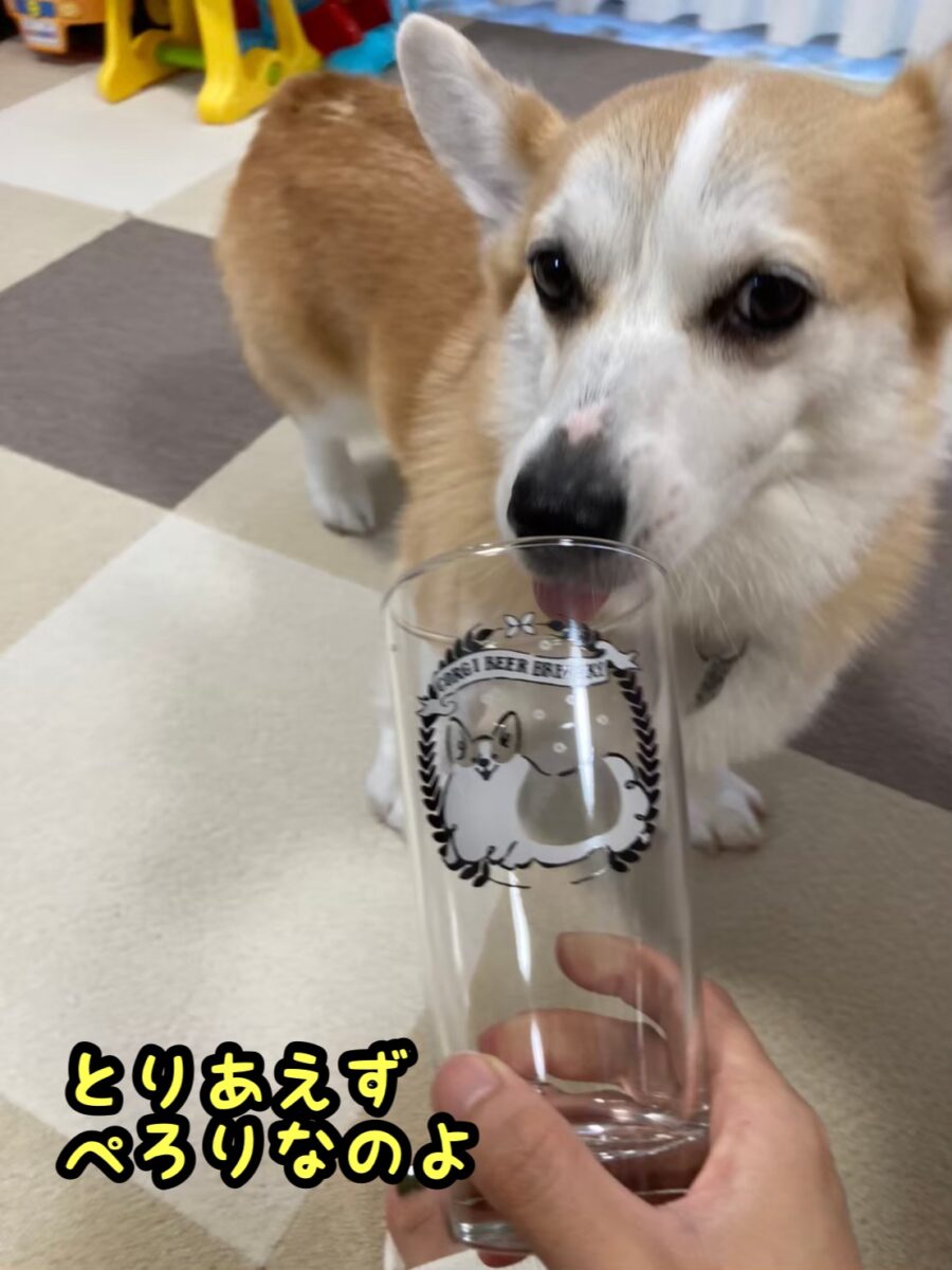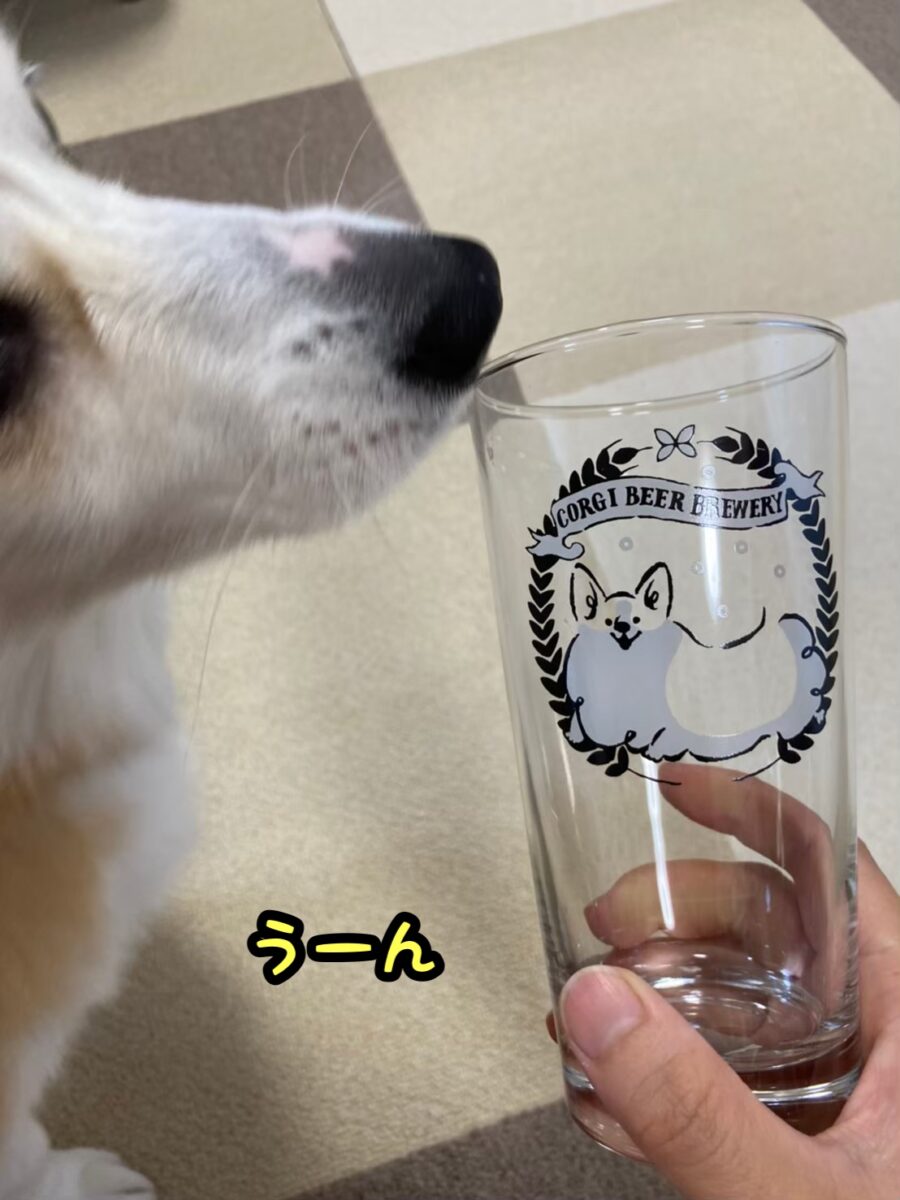 さて、コーギーむぎちゃんはビアグラスもチェックするようです(/・ω・)/