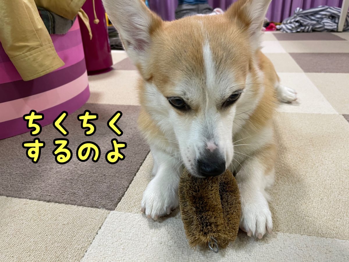 さて、コーギーむぎちゃんはたわしが気に入ったようです(/・ω・)/
