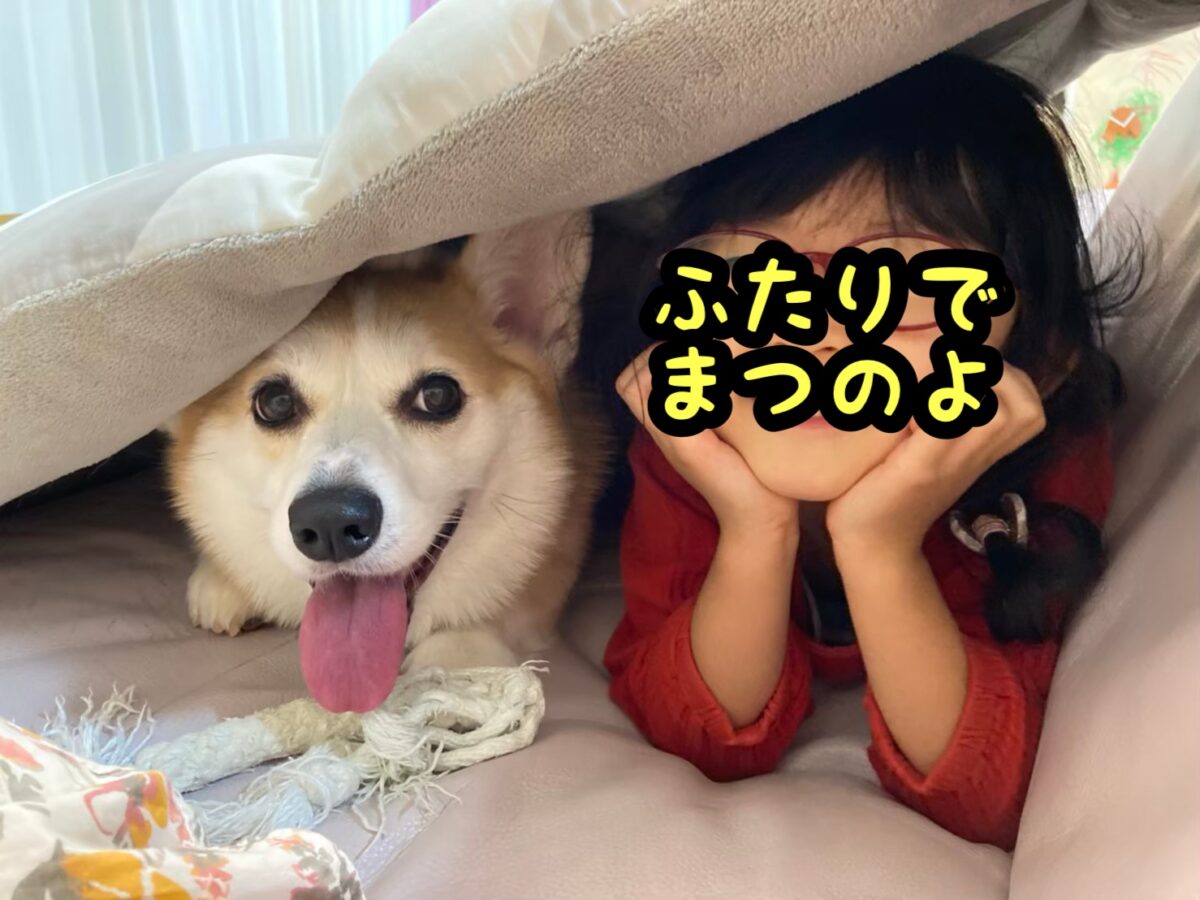 さて、コーギーむぎちゃんは2人体制で待つようです(/・ω・)/