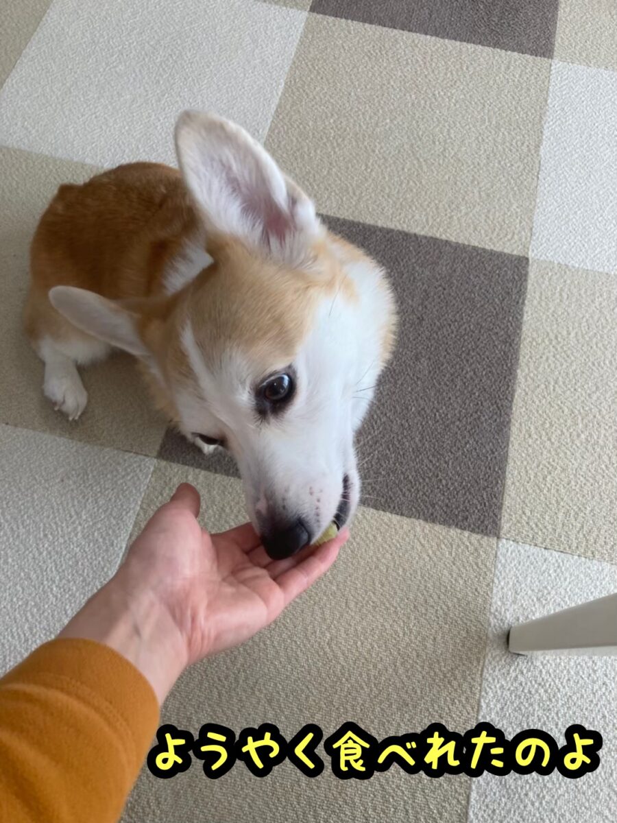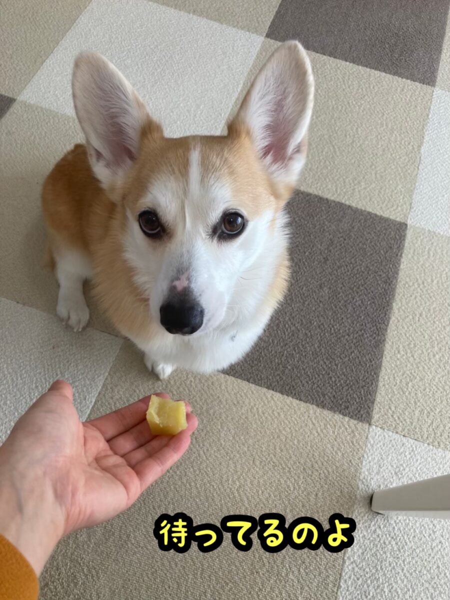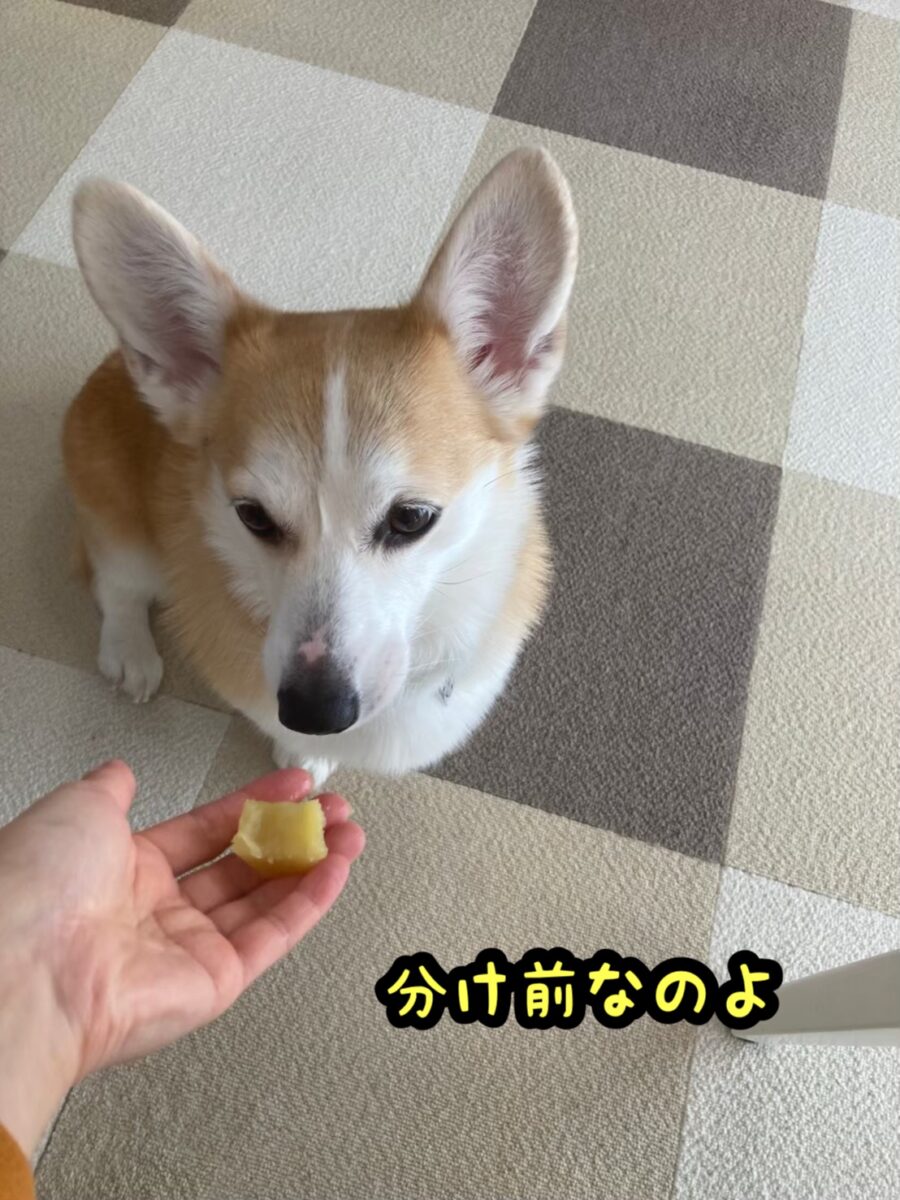 さて、コーギーむぎちゃんは分け前をもらうようです(/・ω・)/